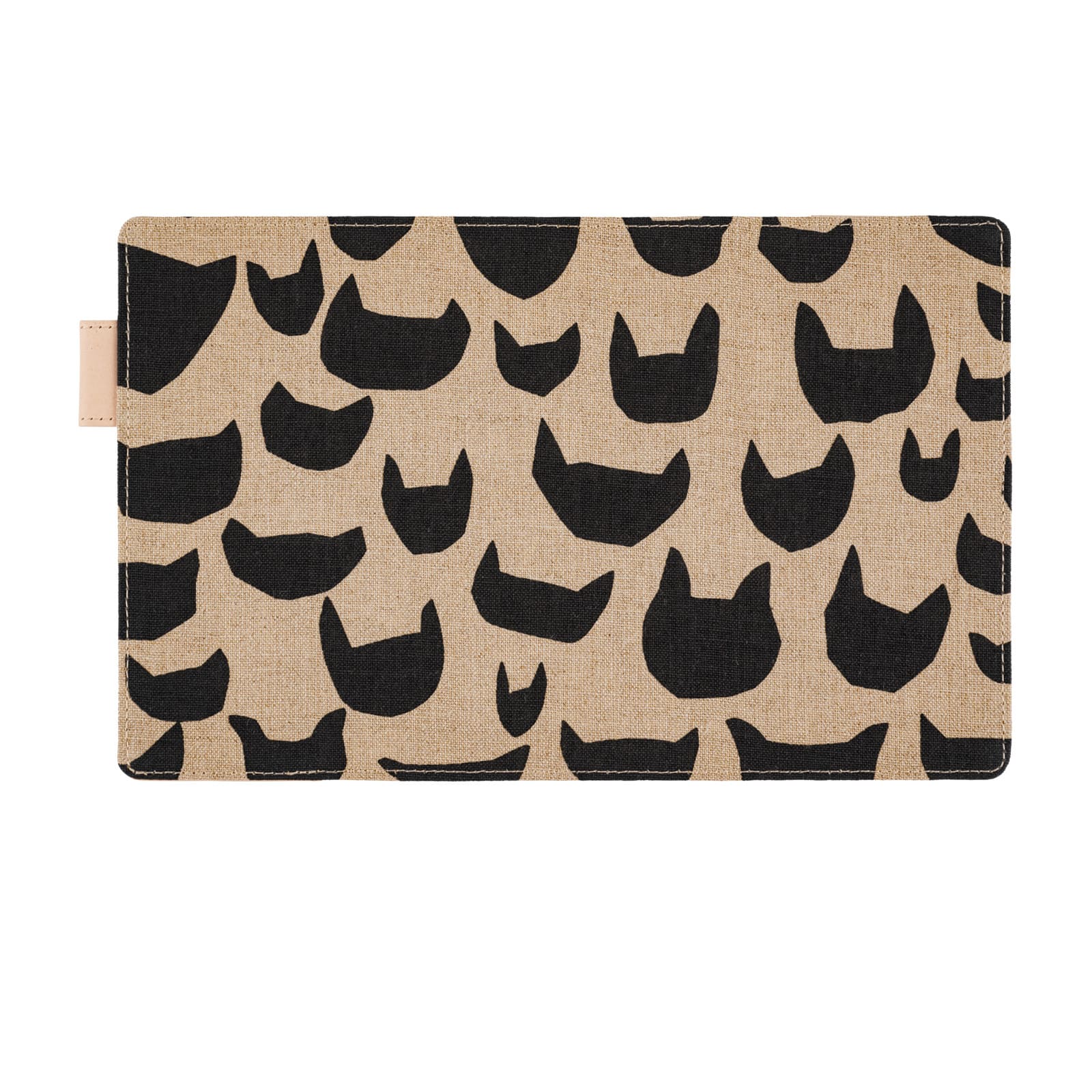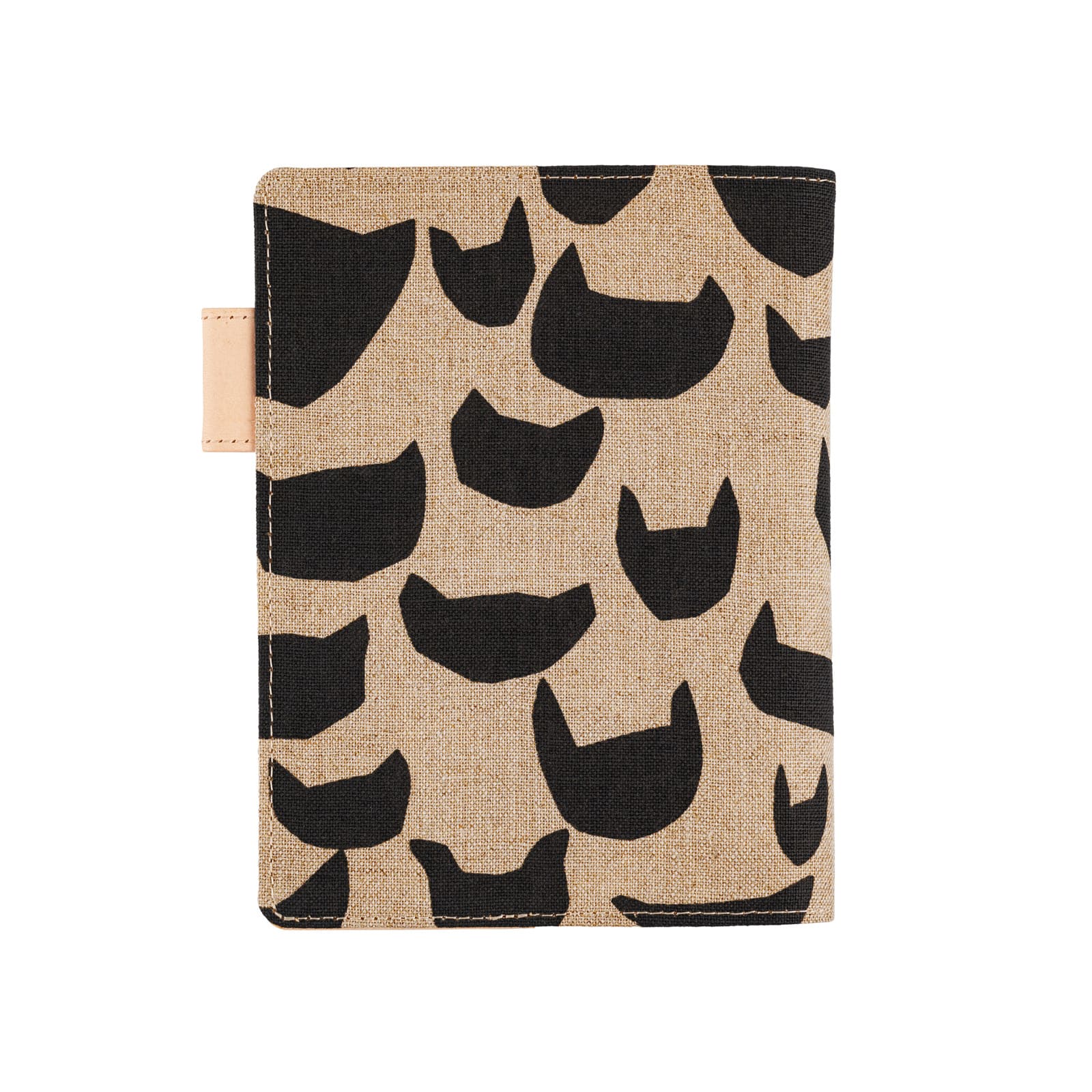 This design depicts a large group of cats who have gathered together to chat. This all-natural black linen, which has a calm look and a natural feel, is printed with cats. It's not too cutesy, so is appealing for adults. Inside the cover is a pen hook that can hold a pen by its clip.