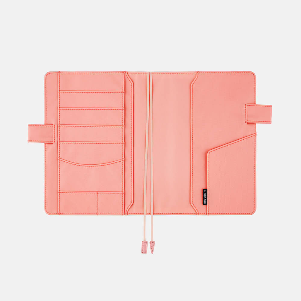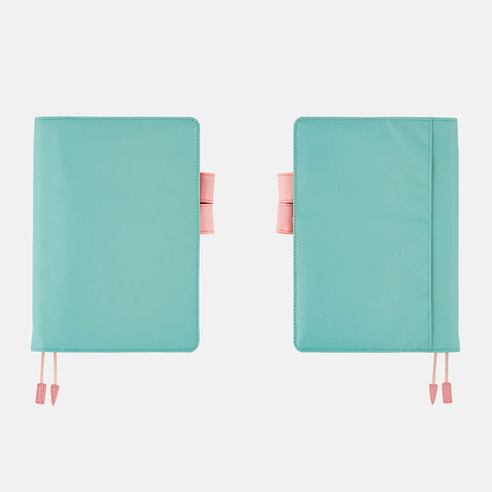 This cover fits an A5 size Hobonichi Cousin book. A light blue reminiscent of soda, matched with pink. Cute, but not overly sweet. Perfect for use with a patterned Cover on Cover. It has "butterfly-stopper" pen holders that uses a pen to hold the cover shut.