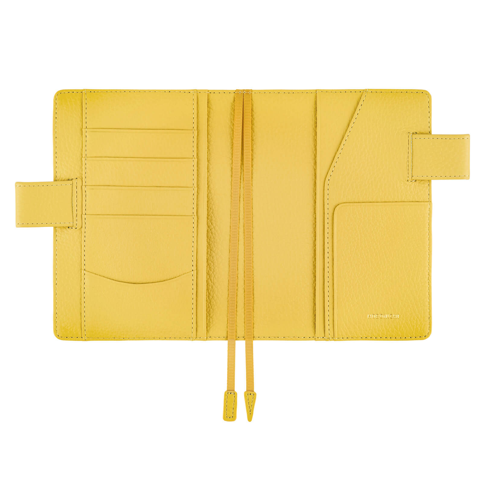 This elegant cover uses leather in a classy, deep shade of yellow. The soft, Italian-made leather of this cover has a fine grain on the surface that creates shading and depth. The touch, volume, and colouring are achieved through the advanced tanning and dyeing techniques of a long-established Italian tannery. It has "butterfly stopper" pen holders, which also function as a clasp to keep the cover shut.