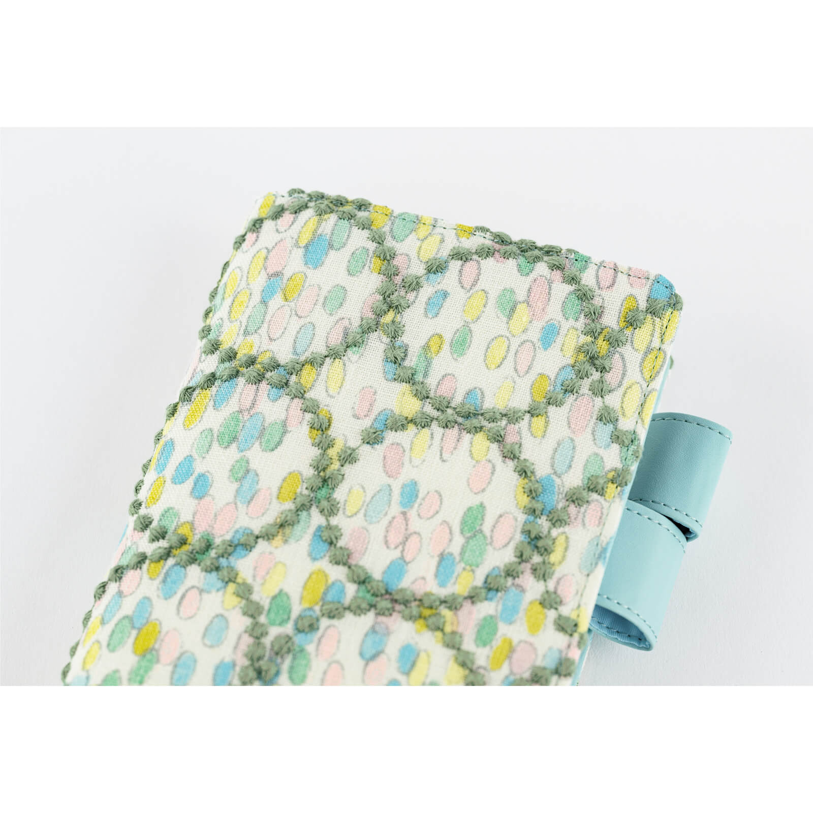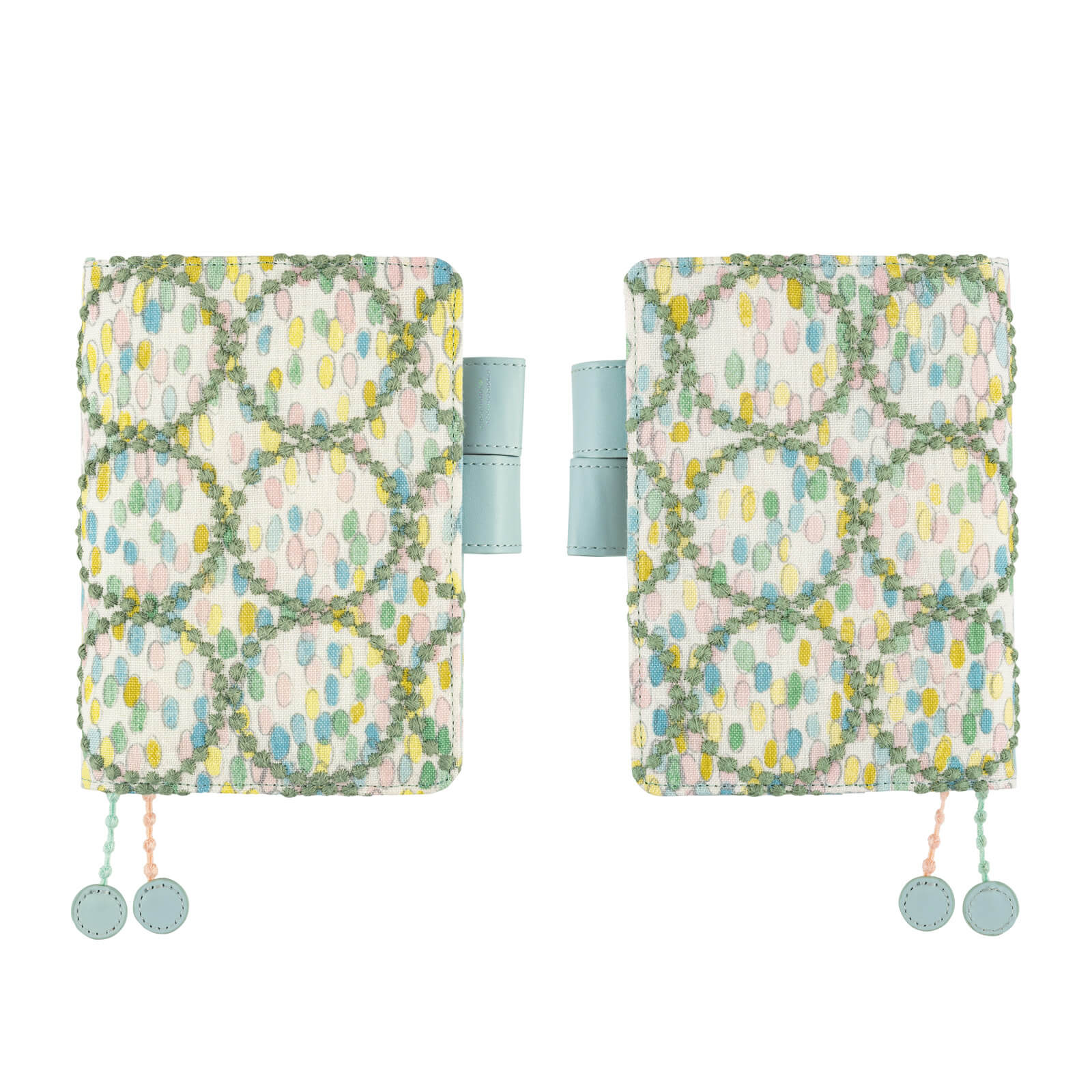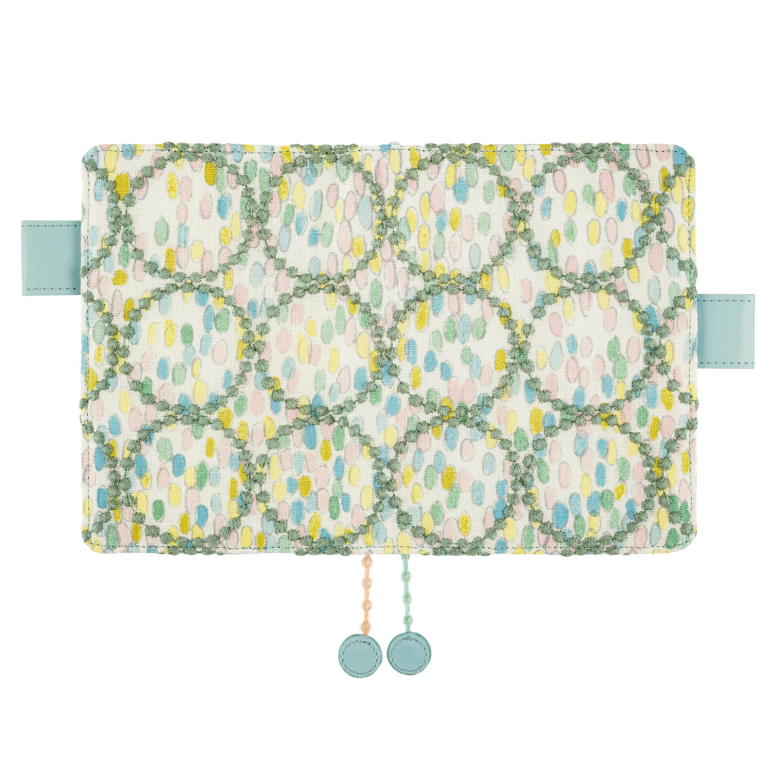 This design combines "jellybeans" and "tambourine." The material is a soft, comfortable linen that's overlayed with the embroidered "tambourine" pattern to give it a fun texture. It has "butterfly stopper" pen holders, which also function as a clasp to keep the cover shut.