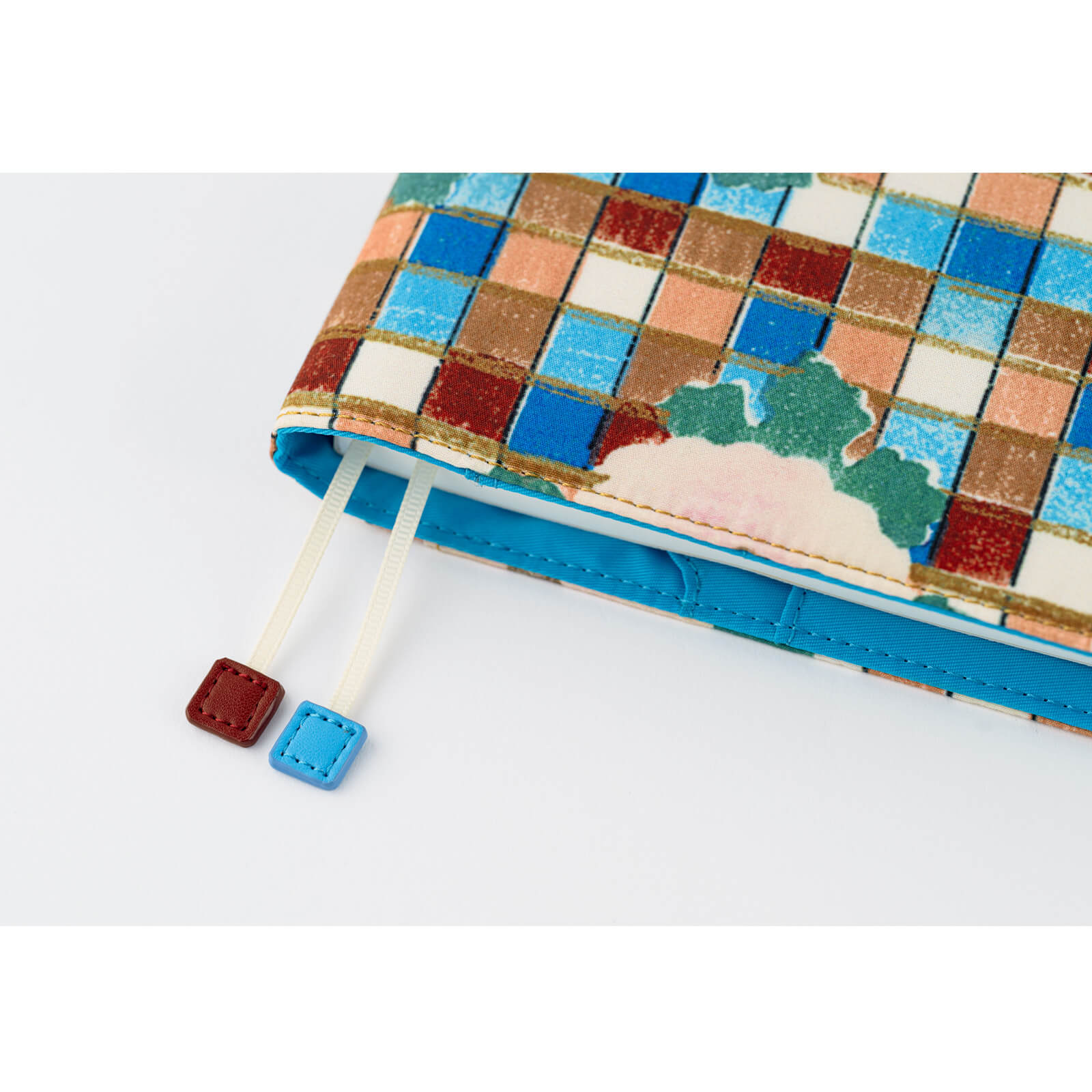 This cover fits an A5 size Hobonichi Cousin book. This innovative design features large flowers on a background of tile or colored glass. This design was selected from Bijutsukai, a collection of craft designs that was published in the Meiji era. (Late 1800s to early 1900s). The bookmark charms are shaped like tiles as if they'd been pulled from the design. It has "butterfly stopper" pen holders, which also function as a clasp to keep the cover shut.