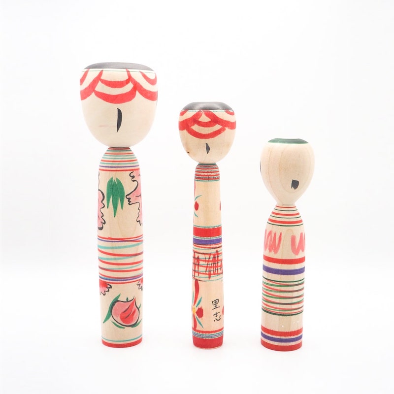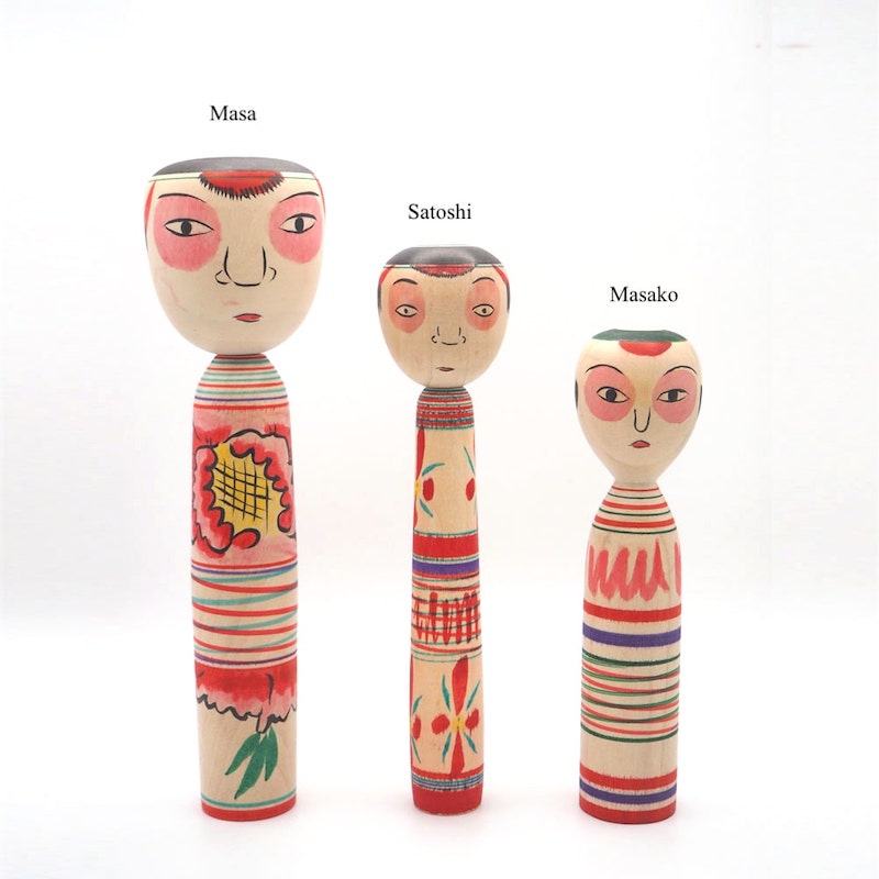Masako: This short yet bright-eyed kokeshi has a powerful aura with colourful lines along its body. H 15cm Head Diameter: 4cm