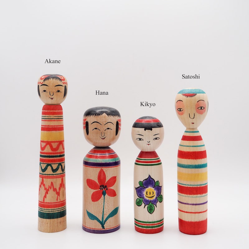 Satoshi: This slender and stripy kokeshi has a dazed and amusing hand-painted expression. The bright stripes and colours are whimsical and unique. Dimensions:H 13 cm Head Diameter: 3 cm